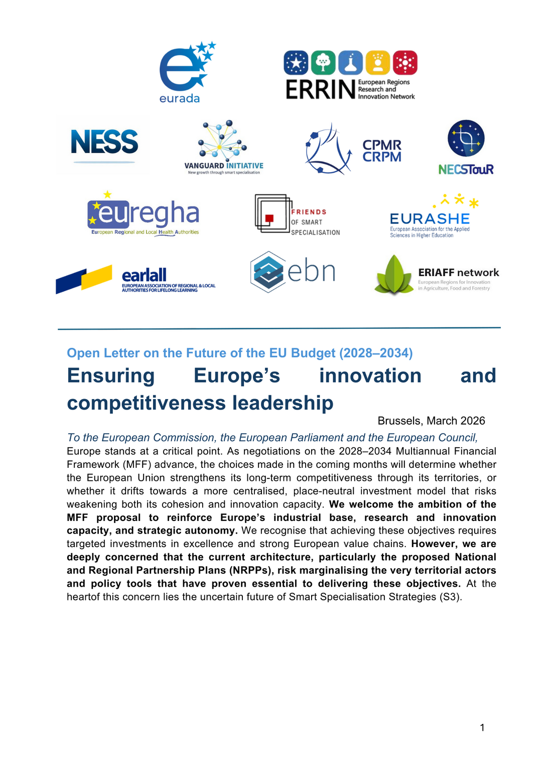 This open letter, signed by twelve organisations, calls on EU institutions to ensure that the next Multiannual Financial Framework preserves a strong place-based approach to innovation and competitiveness. While welcoming the ambition to strengthen Europe’s industrial base and strategic autonomy, the signatories warn that the proposed governance model could recentralise investment decisions and weaken the role of regions. The letter highlights the importance of Smart Specialisation Strategies (S3) and interregional innovation instruments in mobilising regional ecosystems, supporting SMEs and building European value chains, and urges policymakers to safeguard multi-level governance and keep regions at the heart of Europe’s innovation and competitiveness agenda.