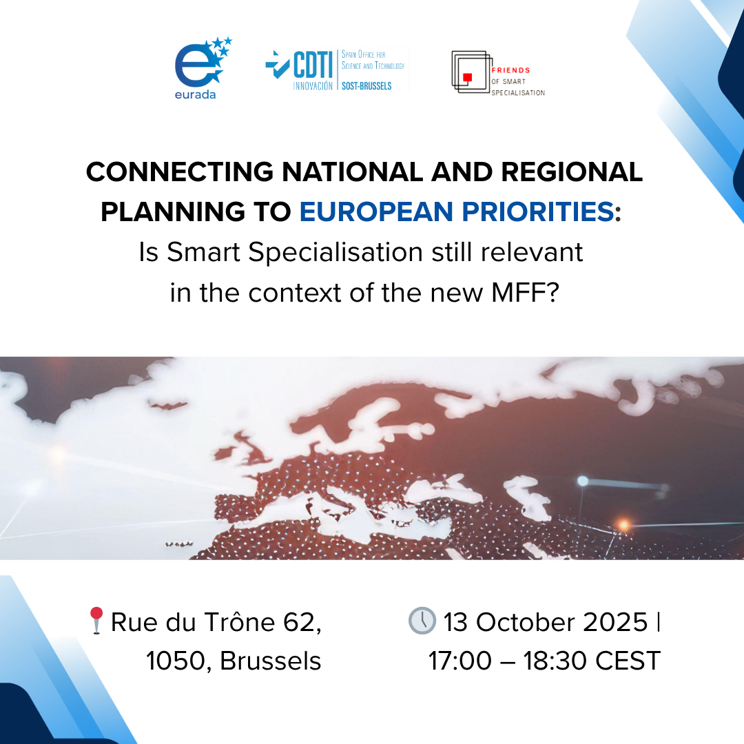 In this context, EURADA is co-organising, in partnership with CDTI SOST and the Friends of Smart Specialisation Workshop, the event "Connecting national and regional planning to European priorities. Is Smart Specialisation still relevant in the context of the new MFF?", scheduled to take place on 13 October 2025, from 17:00 to 18:30 CEST.