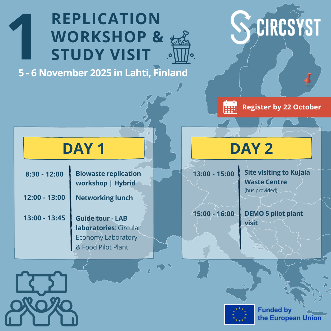 As proud partners of CircSyst, EURADA is delighted to invite you to the project's first replication workshop and study visit to one of the Demonstrator sites working on biowaste solutions, taking place on 5–6 November 2025 in Lahti, Finland. While the study visits are on-site activities alone, please note that the workshop can be attended online as well as in person, as it will take place in hybrid mode.